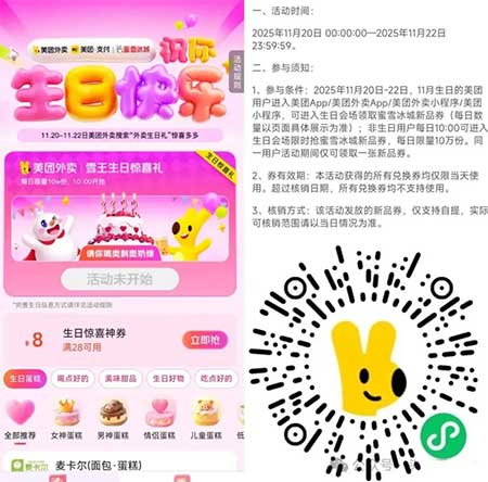 11.20-22日 每天⏰10点 美团搜:外卖生日礼 抢10万份蜜雪冰城新品蜷