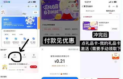 2️⃣返回zfb首页搜索: 蜜雪冰城小程序 点我的-礼品卡-自定义5亓