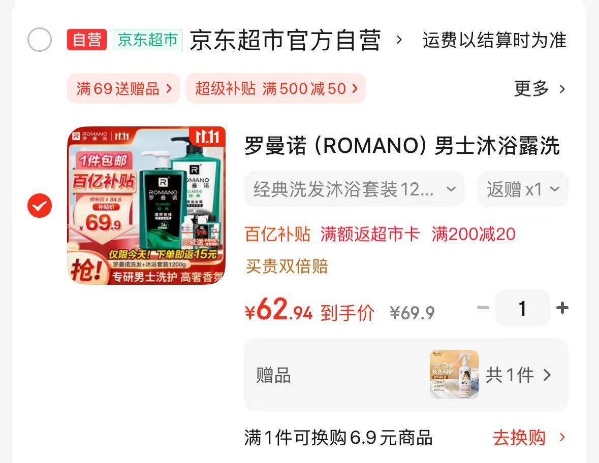 跳转APP领200-20会场卷 自营罗曼诺 男士洗护套装1.2kg 含沐浴露450ml+洗发水600ml