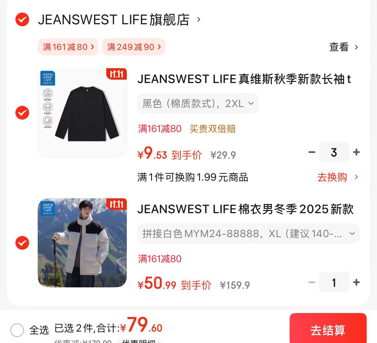 先领补贴卷 真维斯 男加厚潮流保暖棉服 真维斯 简约纯色休闲打底衫 一起79.6元