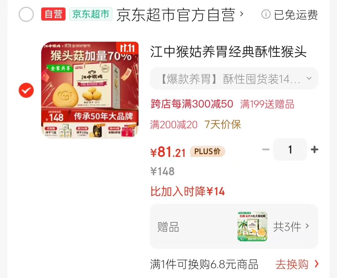 Plus凑后81.21元,赠猴菇头饼干48g*3袋